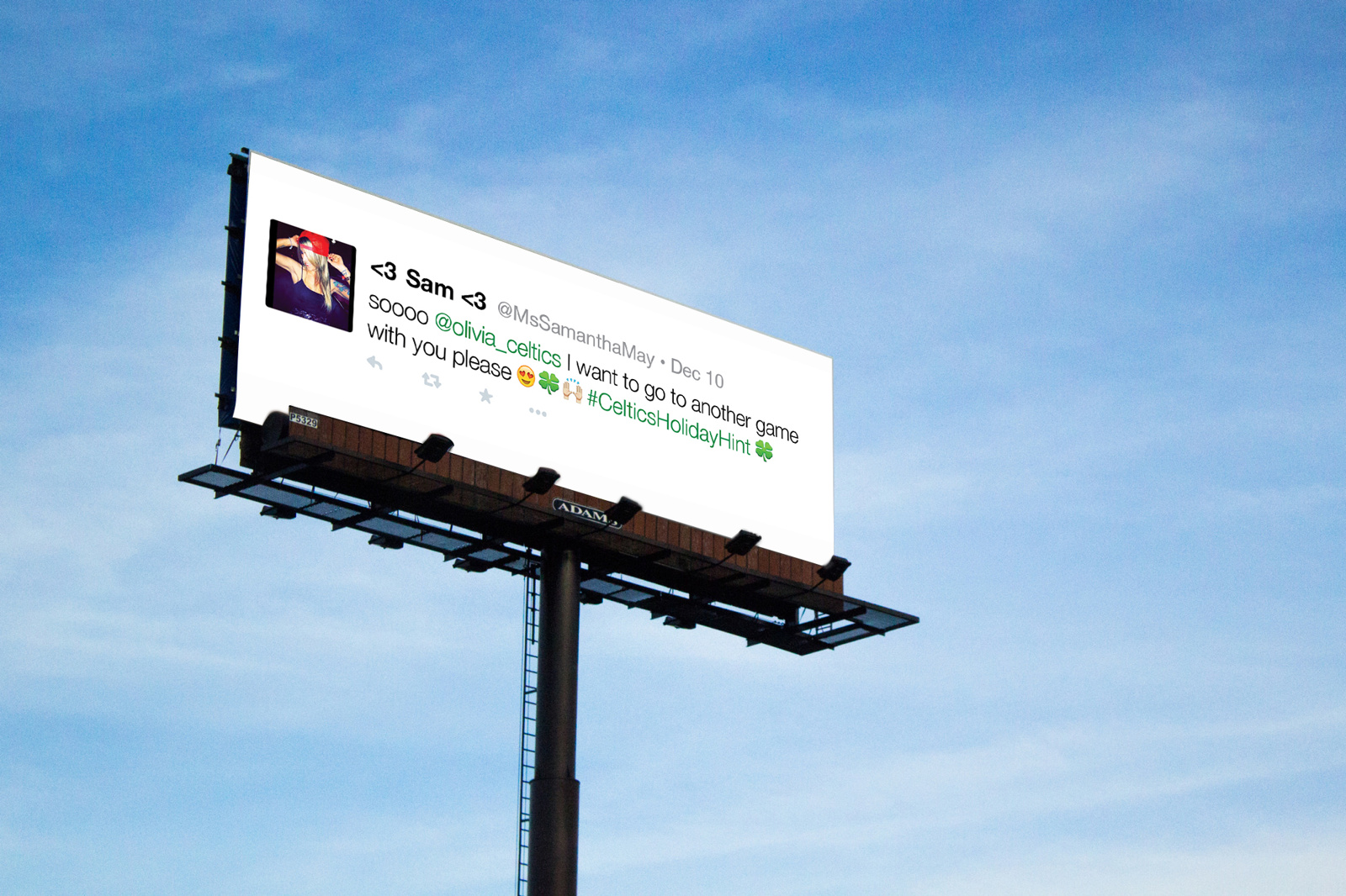 We helped fans tell loved ones what they wanted for the holidays in the least subtle way, sharing their tweets on billboards around Boston. In addition we shared tweets on the jumbotron during games and through Celtics players twitter feeds.
